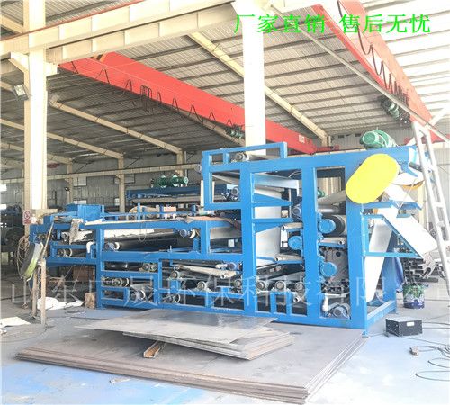 带式泥浆压滤机是通过两条滤带缠绕在一系列顺序排列、大小不等的辊轮上,利用滤带间的挤压和剪切作用,来脱除料浆中水分的一种压滤设备,具有着能连续作业、自动化程度高、节能、使用维护方便等优点,是一种进行污泥脱水减量化处理的理想设备。