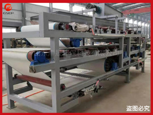 污泥经布料斗均匀送入网带,污泥随滤带向前运行,游离态水在自重作用下通过滤带流入接水槽,主要作用是脱去污泥中的自由水,使污泥的流动性减小,为进一步挤压做准备。