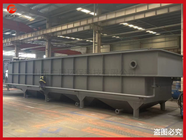 (2)气浮机:经加药反应后的污水进入气浮的混合区,与释放后的溶气水混合接触,使絮凝体粘附在细微气泡上,然后进入气浮区。絮凝体在气浮力的作用下浮向水面形成浮渣,下 层的清水经集水器流至清水池后,一部分回流作溶气使用,剩余清水通过溢流口流出。气浮池水面上的浮渣积聚到一定厚度以后,由刮沫机刮入气浮机污泥池后排出,气浮底部的淤泥定时间用抽粪车吸出外运,或者是打开排污阀自流入污泥收集池,用污泥脱水机脱水处理,从而减少二次污染,安全可靠。