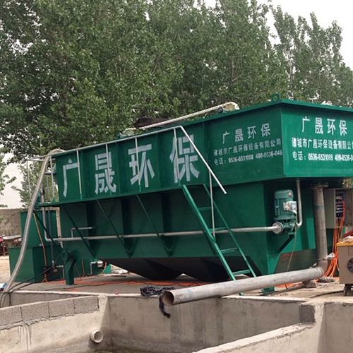 (2)气浮机:经加药反应后的污水进入气浮的混合区,与释放后的溶气水混合接触,使絮凝体粘附在细微气泡上,然后进入气浮区。絮凝体在气浮力的作用下浮向水面形成浮渣,下 层的清水经集水器流至清水池后,一部分回流作溶气使用,剩余清水通过溢流口流出。气浮池水面上的浮渣积聚到一定厚度以后,由刮沫机刮入气浮机污泥池后排出,气浮底部的淤泥定时间用抽粪车吸出外运,或者是打开排污阀自流入污泥收集池,用污泥脱水机脱水处理,从而减少二次污染,安全可靠。