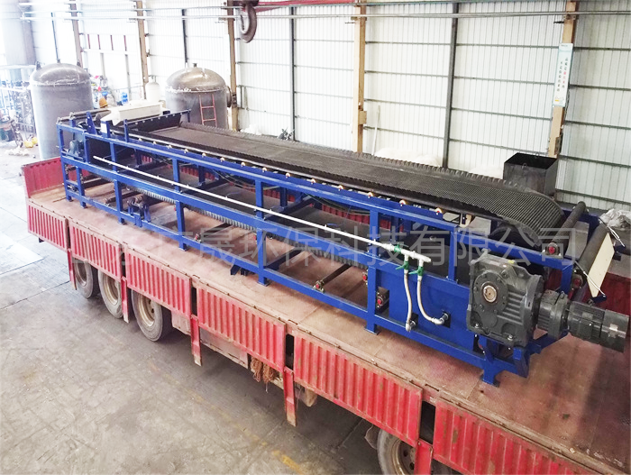 洗煤真空过滤机以滤布为过滤介质,采用整体的环形橡胶带作为真空室。环形橡胶带由传动装置传动连续运行,滤布铺敷在胶带上与之同步运行,腔带与真空滑台接触(真空室与橡胶带间装有环形摩擦带并通入水形成水密封),料浆由布料器均匀地分布在滤布上。当真空室接通真空系统时,在橡胶带上形成真空抽滤区,滤液穿过滤布经橡胶带上的横沟槽汇总并由中心孔进八真空室,固体颗料被截留在滤布上形成滤饼,随着橡胶带的移动,已形成的滤饼受压力差影响逐步被脱干,后滤布与胶带分开,在卸料辊处将滤饼卸出,进入真空室的液体经气水分离器排出。卸除滤饼后滤布经清洗后获得回用,再经过一组支撑辊和纠偏装置重新进入过滤区,开始进入新一过滤周期。铜锌矿真空带式过滤机实现了真正意义上的连续运行、连续过滤,物料从进料、脱水、卸渣到滤布清洗,可以不间断的连续进行。
